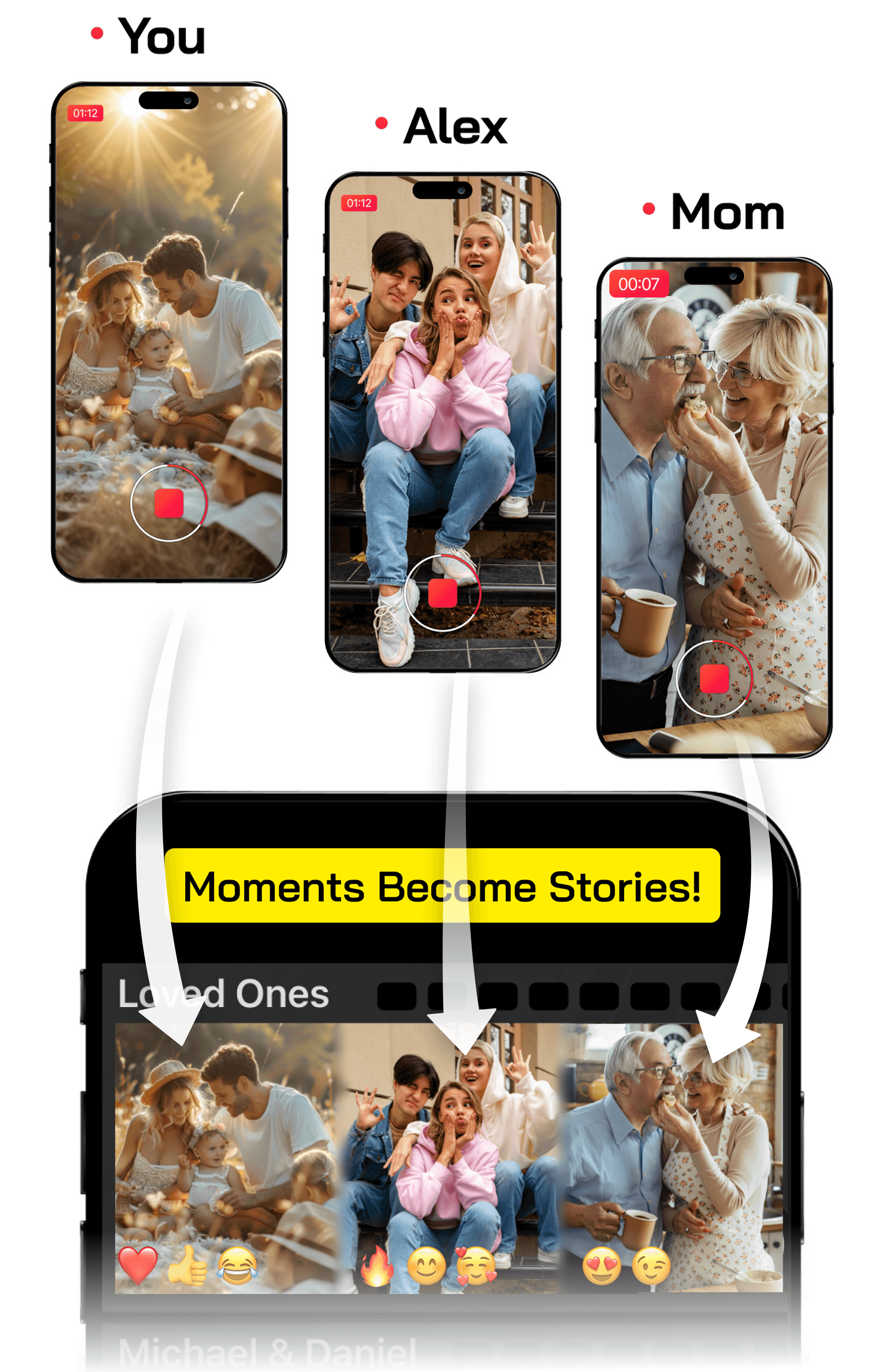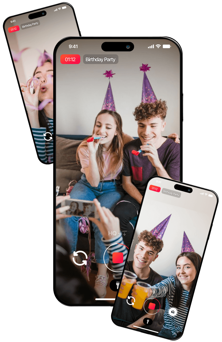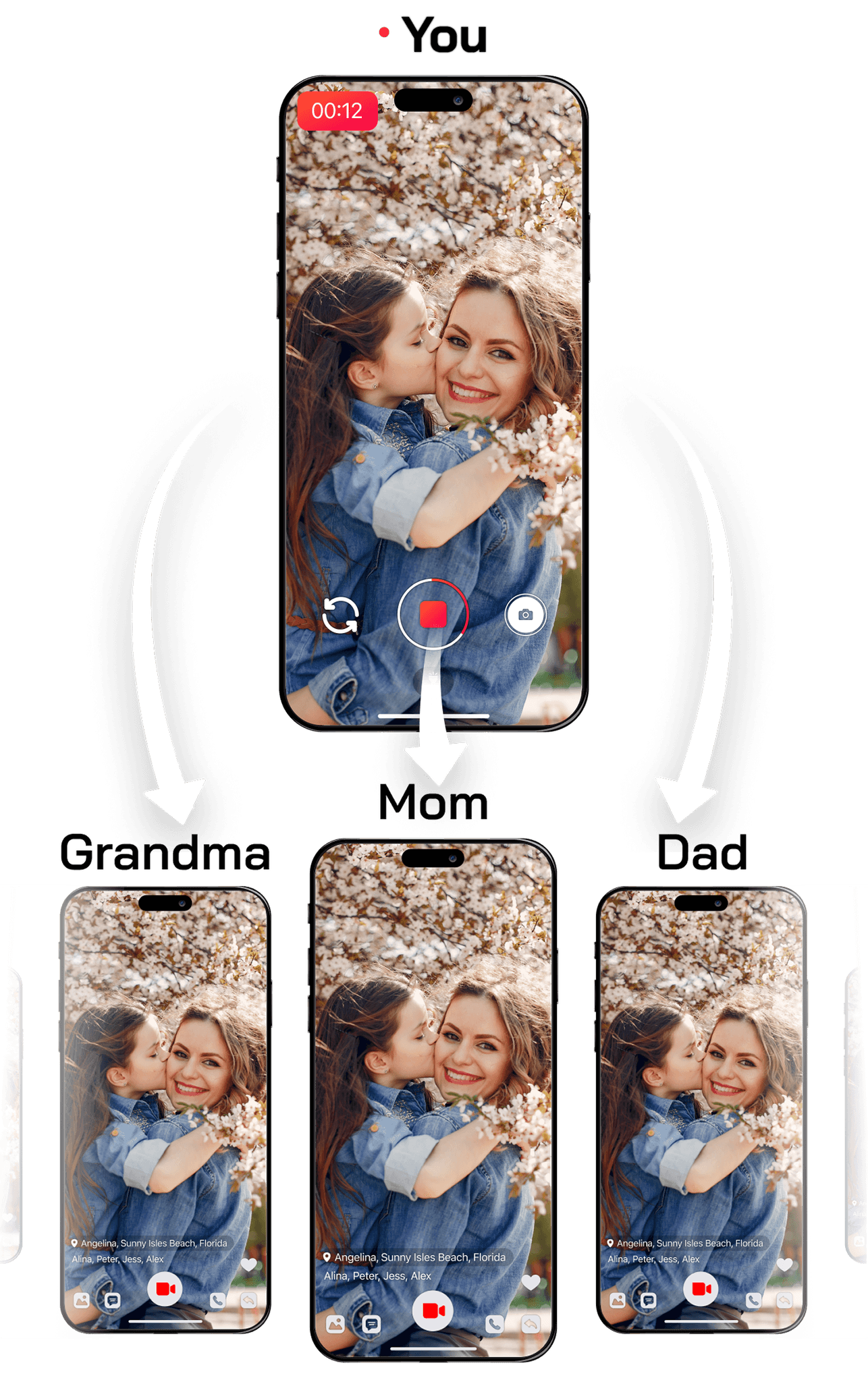 When filming together, you appear in their clips—finally seeing yourself in the moment. Relive your gatherings from the most exciting angles!